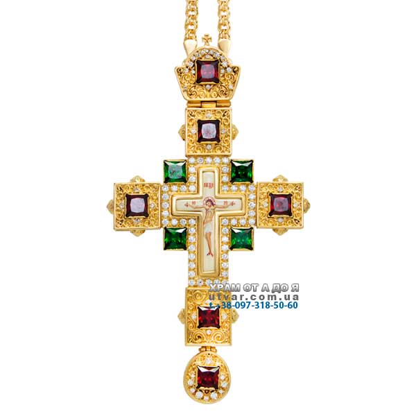 Хрест для священика латунний позолочений з принтом та вставками та ланцюгом
