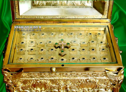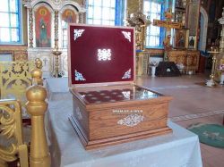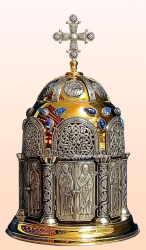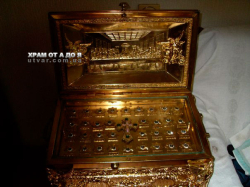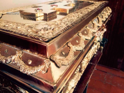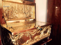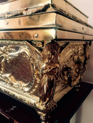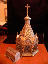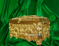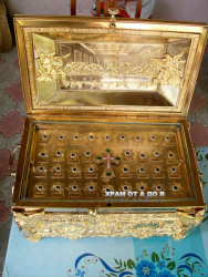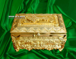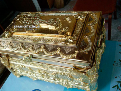 Ковчег большой размеры 670*350*350 на 75 мощей. Эксклюзивная работа в одном экземпляре. Есть замок с ключом который его закрывает. Есть ручки чтобы переносить. Полностю ручная работа. Материал - медь и бронза. Покрытие никелем и золотом.